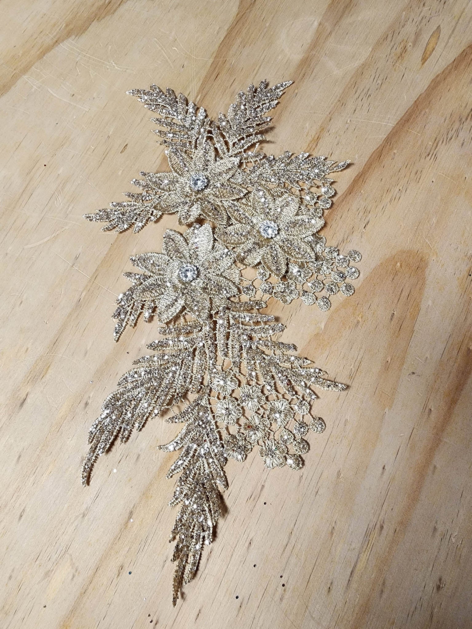 This applique adds a nice rich looking detail to your outfit with little cost. It has an embroidered venice base that has glitter sprinkled on it.